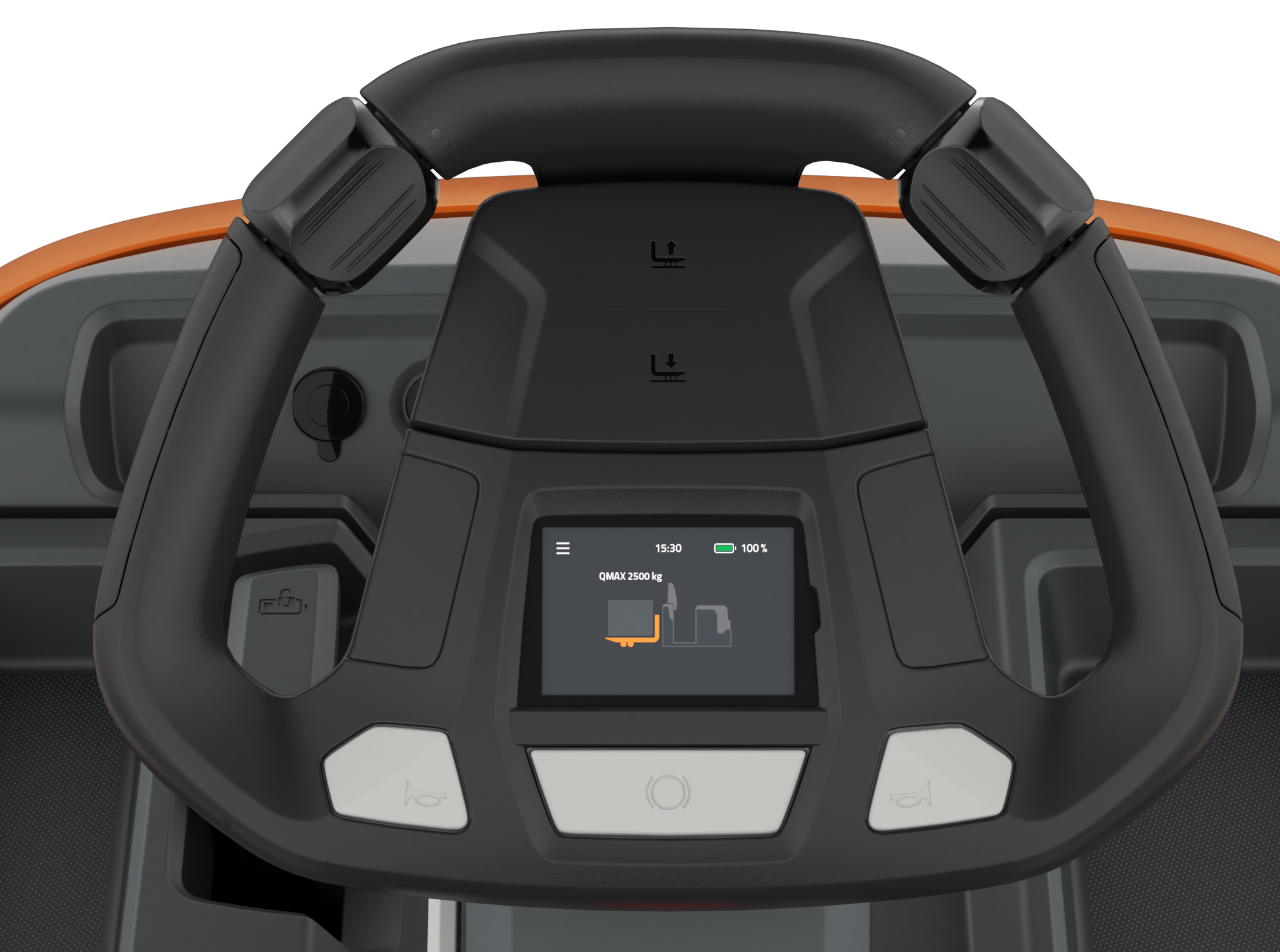 Its new ergonomic shape provides a more car-like driving experience, and thanks to the multiple ways of operating the drive controls and raising or lowering the forks, the operator can drive, steer, and lift the forks with just one hand.