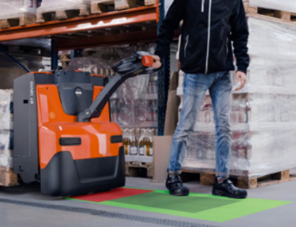 The control handle is equipped with an emergency "belly button" that, when pressed, reverses the truck to prevent trapping the operator between the truck and the obstacle.