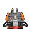 The control handle is equipped with an emergency "belly button" that, when pressed, reverses the truck to prevent trapping the operator between the truck and the obstacle.