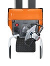 The control handle is equipped with an emergency "belly button" that, when pressed, reverses the truck to prevent trapping the operator between the truck and the obstacle.